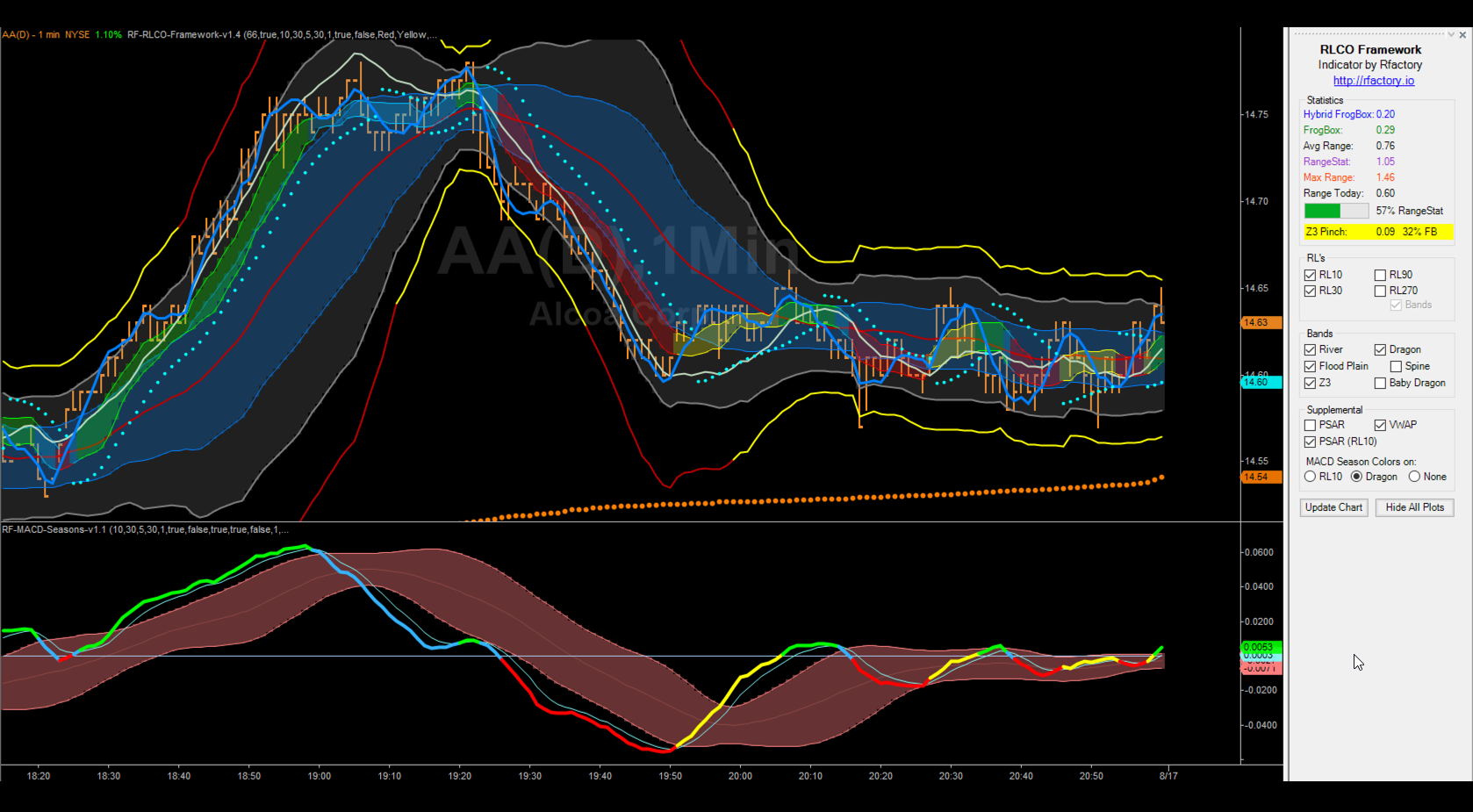 The RLCO Framework elements include the Linear Regression lines (RL10, RL30, RL90, RL270), the Bands (River, Flood Plain & Z3 Bands as well as the Dragon and the Baby Dragon) and a host of other Supplemental tools that are often used in conjunction with the above such as VWAP, PSAR and the customized PSAR on the RL10 that Dr. Long pioneered.
